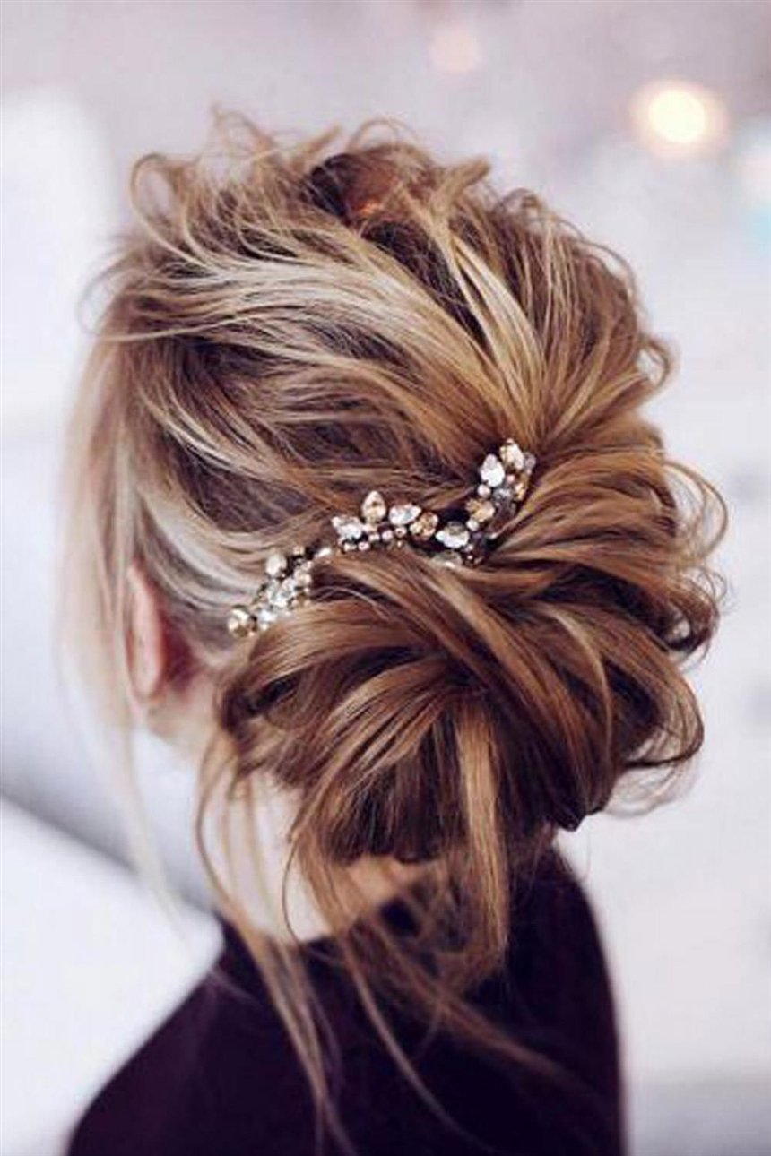Классический пучок может приобрести совсем другое значение, если украсить его красивым аксессуаром. Сделайте легкие кудри и начес. Пальцами соберите волосы сзади в объемный пучок, оставив несколько прядей спереди. Украсьте пучок заколкой со стразами.
