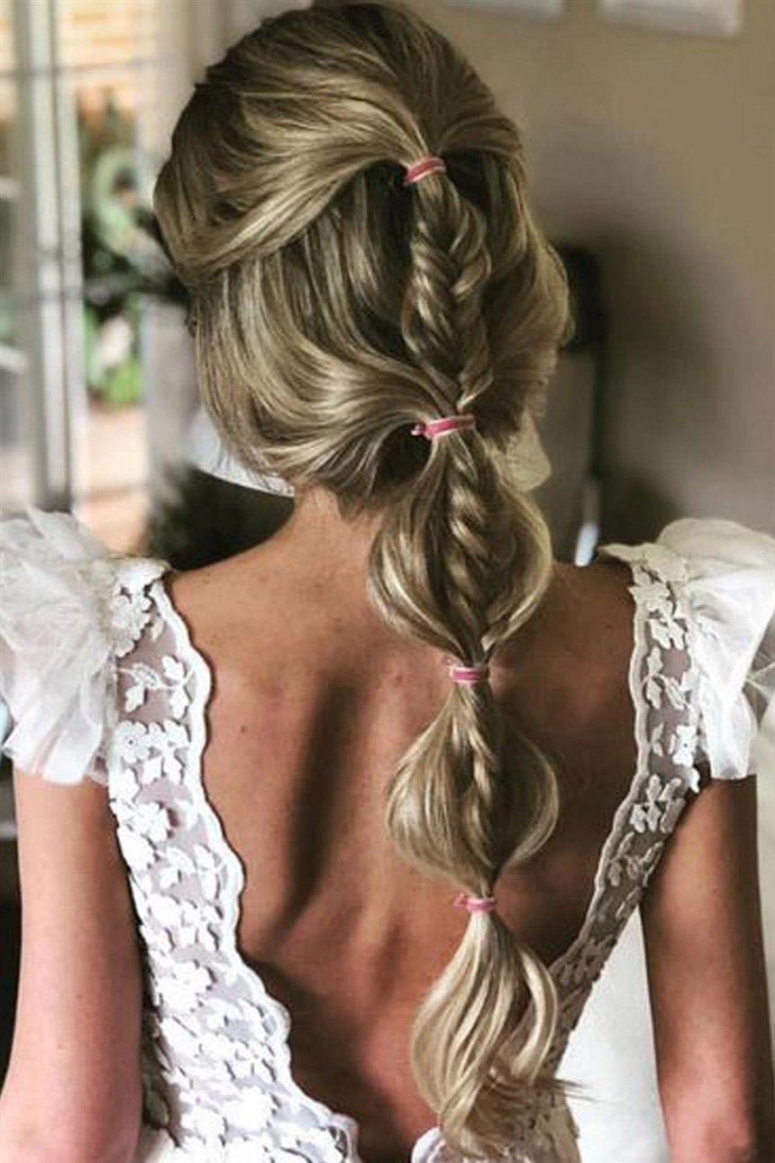 Для невест с длинными волосами. Соберите волосы с верхней части головы и завяжите их сзади, как мальвинку. Заплетите косичку до кончиков волос. Соберите распущенные волосы и соедините их с косичкой на уровне шеи при помощи бархатной ленточки, как на фото. Продолжайте делать то же самое через определенный промежуток. Ваш ориентир – прическа, что на фото.