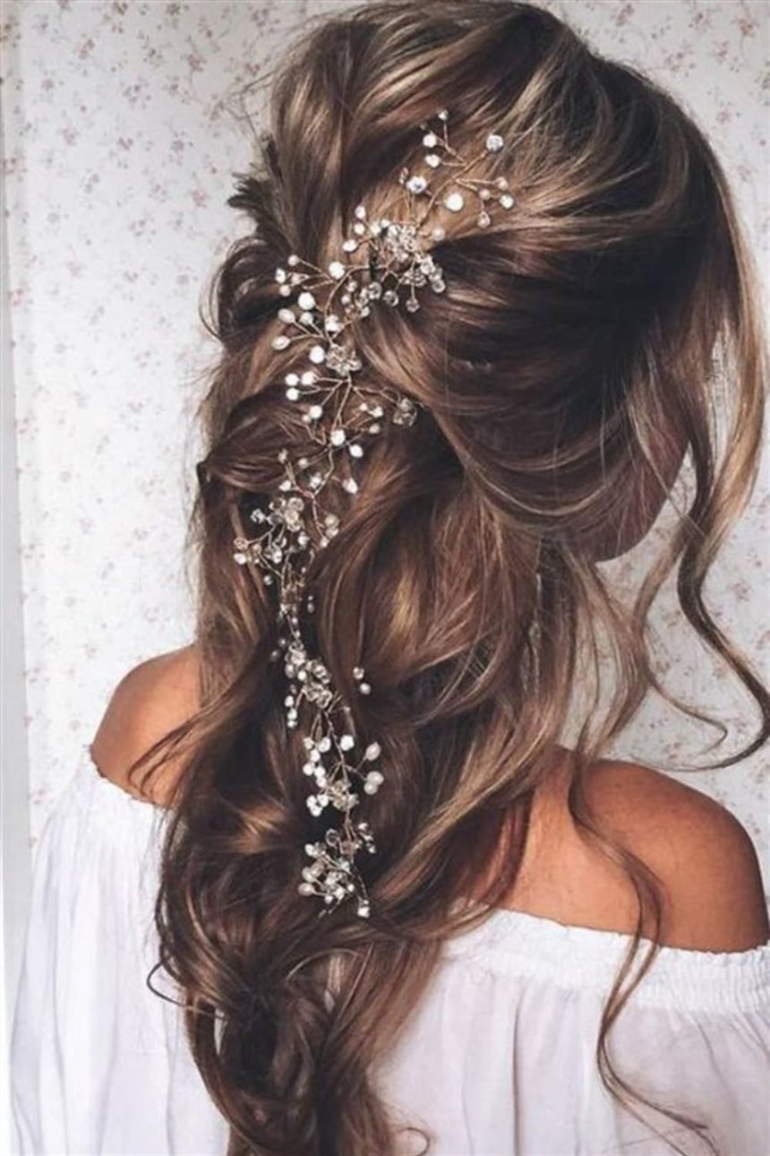 Вам понадобится оригинальная заколка, имитирующая нежную ветвь с мелким цветением. Накрутите волосы, придайте им объема и заплетите свободную, небрежную косу от макушки. Поверх косы закрепите эту заколку при помощи шпилек.