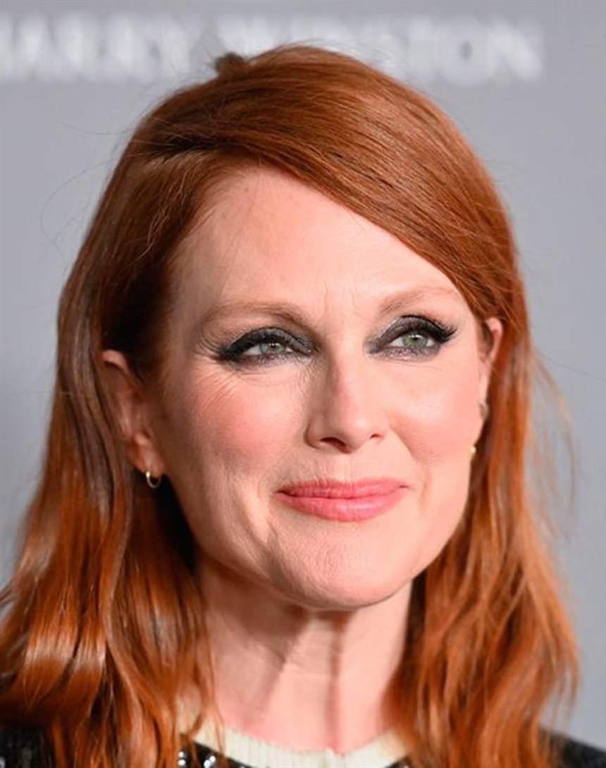 Очень простой вариант. Дымчатые глаза – это классика макияжа, которая спасет вас при любых обстоятельствах. Да, ходит молва, что очень сложно аккуратно наносить этот макияж, растушевывать его, но все не совсем так. Просто нанесите тени пальцами: начинайте с самого светлого оттенка (нанесите его первым слоем) и продолжайте наносить другие оттенки, пока не получится мутный (дымчатый) цвет. Нельзя сразу начинать с темных теней, так как не получится желаемый эффект. Макияж Джулианны Мур, созданный визажистом Ханг Ванго, выглядит идеально.