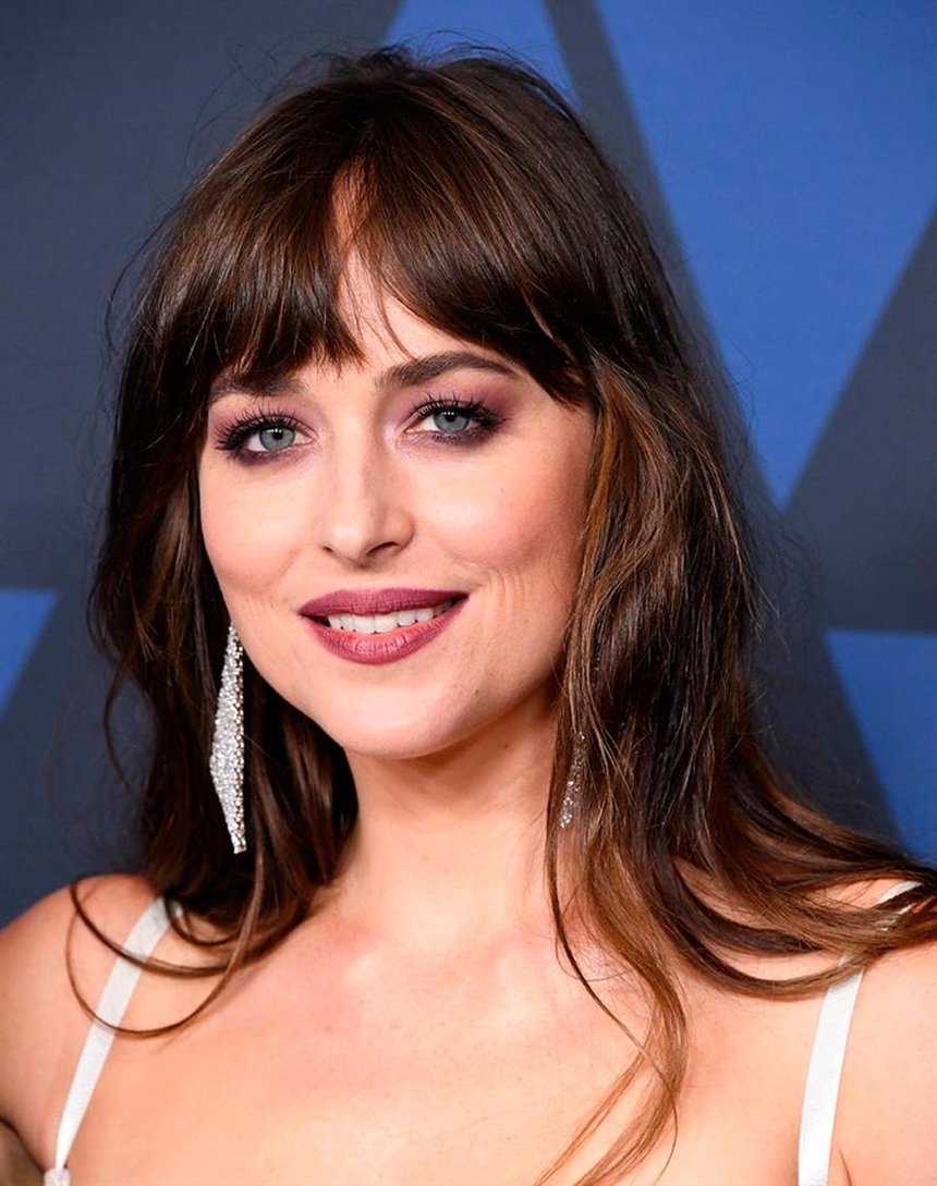 Актриса Дакота Джонсон предпочла оригинальный макияж гранатового цвета с эффектом дымчатых глаз. Помада такого же цвета и нейтральные оттенки макияжа адаптируются под любой цвет кожи. Хороший вариант для тех, кто не любит чрезмерный блеск.