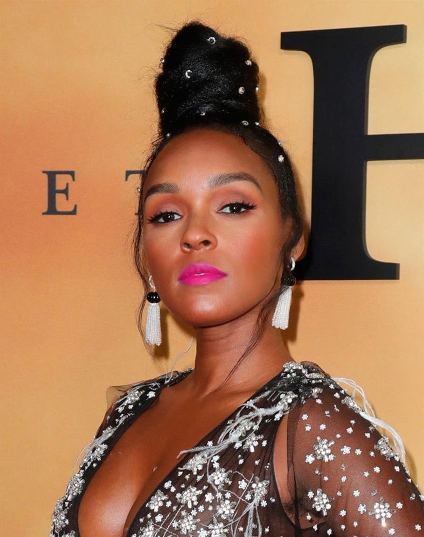 Красная помада – это не единственный роскошный вариант для вечернего макияжа. Выйдите за рамки привычного, используя матовую помаду цвета фуксии, как Жанель Монэ.
