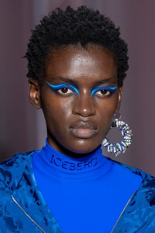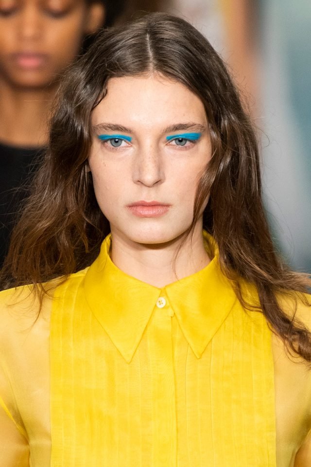 Яркость и необычность тенденций 2019 года состоит не только в одежде оверсайз и аксессуарах XXL. Трендовый макияж 2019 года имеет две крайности: яркость и непримечательность. Carolina Herrera поставила на яркость, бренд использовал яркую синюю подводку и нестандартные линии.