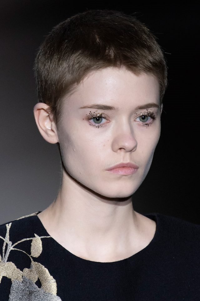 На этом показе все модели сияли блестками и стразами. А особенно – их макияж. Золотые блестки на верхнем веке могут стать идеальным вечерним макияжем, который больше не нуждается ни в каких дополнительных штрихах. Чистое лицо и губы натурального цвета идеально дополняют образ.