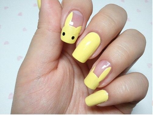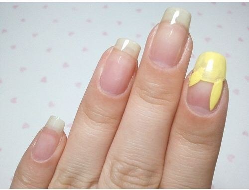 2. Покрываем ногти бесцветной основой. Половину ногтя указательного пальца закрашиваем желтым лаком и рисуем ушки.