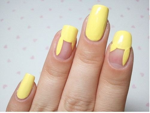 3. Таким же образом раскрашиваем ноготь безымянного пальца. Средний палец и мизинец полностью закрашиваем желтым лаком.