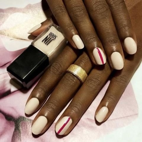 Этой осенью стоит обратить свое внимание на лаки более теплых приглушенных оттенков. Накрасьте ногти светло-бежевым лаком и сделайте один из самых простых и незатейливых дизайнов – просто нарисуйте одну вертикальную линию на акцентном ногте.