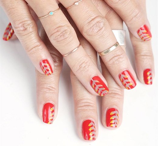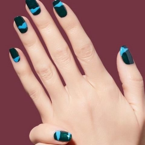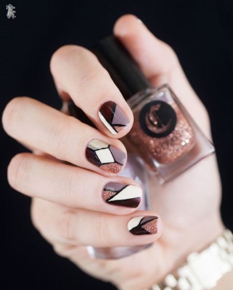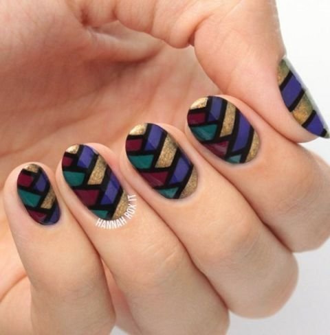 Чтобы сделать маникюр с этим геометрическим узором, вам потребуется много времени, но результат того стоит. Если вы хотите более гламурный дизайн, то используйте лаки изумрудных оттенков, а для осеннего маникюра – лаки золотистого и кирпично-красного оттенков.