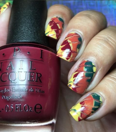 Мы привыкли, что для такого окрашивания используют обычно яркие радужные цвета, но если вы хотите тематический осенний маникюр с подобным дизайном, то отдайте предпочтение лаку желтого, багряного, оранжевого и темно-зеленого оттенков.