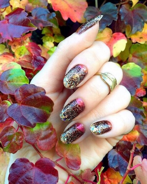 Если вам нравится осень, сделайте себе градиентный маникюр в карамельно-красных, темно-коричневых и золотисто-зеленых оттенках.