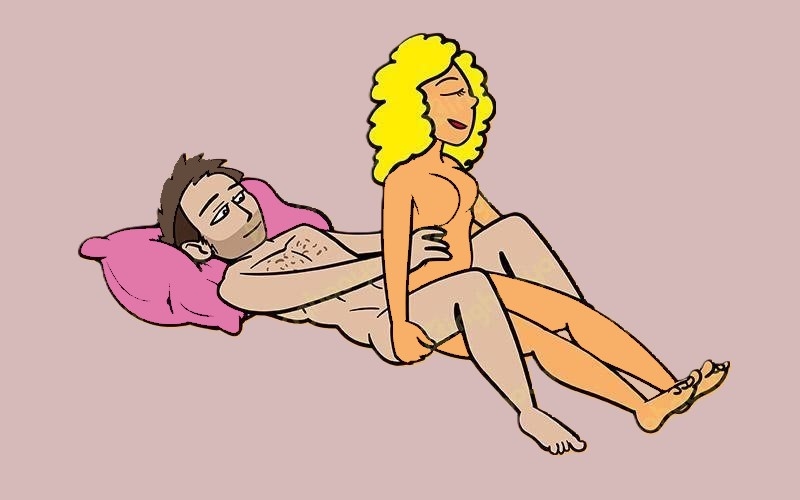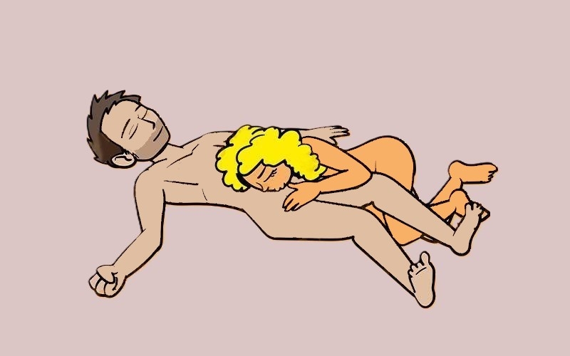 Мужчина ложится на бок на край дивана, сгибает ноги в коленях, разводит их в стороны и скрещивает лодыжки. Женщина лежит спиной к любовнику, поддерживая верхнюю часть тела, опираясь на локоть. Одна из ее ног касается пола кончиками пальцев. Другая слегка согнут и поднят вверх. В этой позе мужчина может ласкать грудь девушки, целовать ее губы, спину и шею.