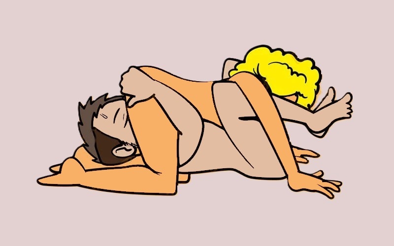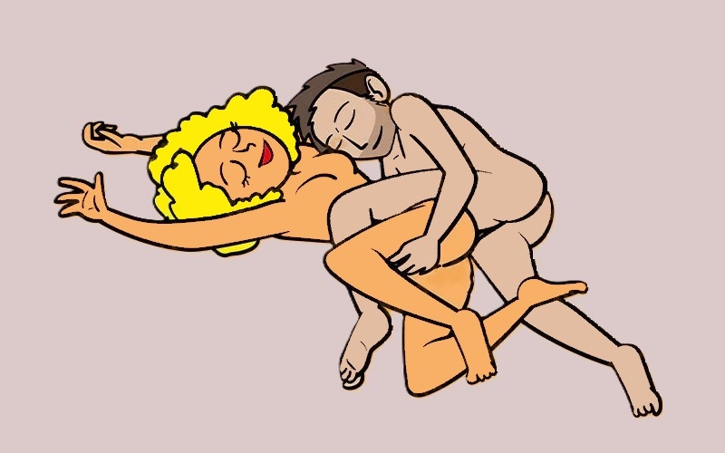 Отличная поза для пробуждающего утреннего секса! Женщина лежит на боку, руки подняты вверх, ноги согнуты в коленях и разведены в стороны. Мужчина перекидывает одну согнутую ногу ей на бедро, другая его нога прямая. Одной рукой он берет бедро своей партнерши и проникает в нее сзади. Эта поза очень актуальна для тех мужчин, которые любят во время сна закидывать ногу на женщину — нужно просто вставить член и начать делать сладкое желе из партнерши.