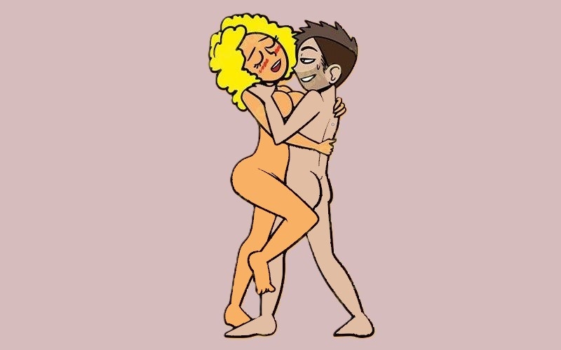 Дама закидывает одну ногу мужчине на бедро, а вторую кладет ему между ног. Партнер-мужчина также обнимает одной рукой талию женщины, другой ласкает ее грудь и шею.