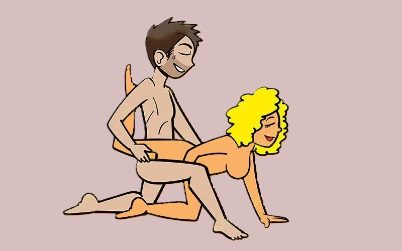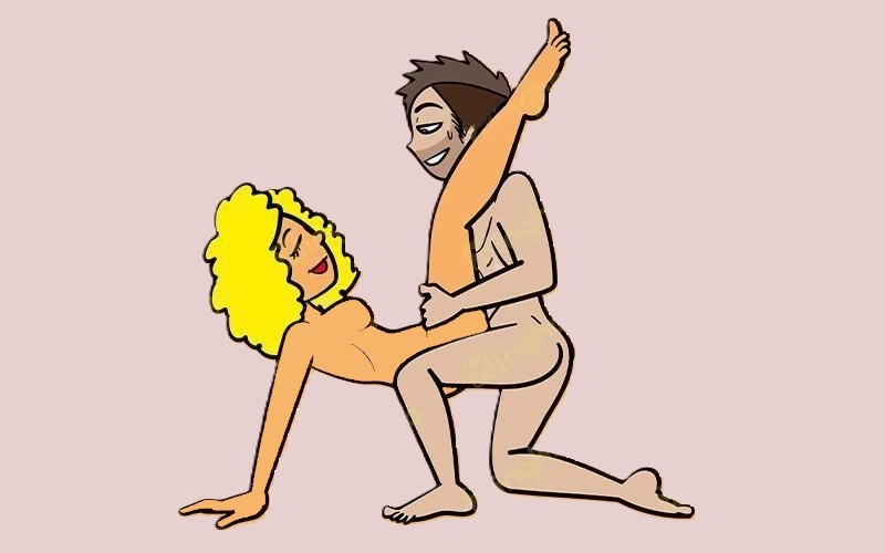 Классическая «собачья» поза с глубоким проникновением. Женщина стоит на четвереньках, ноги вместе, руки на уровне плеч, опора на ладони, спина слегка прогнута, голова запрокинута. Мужчина становится на колени позади своей партнерши так, что его ноги оказываются между ее ступнями. Он кладет руки на ее талию или бедра и подталкивает женщину в такт своим движениям.