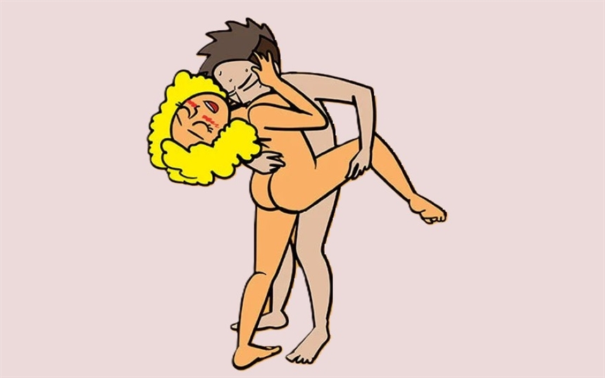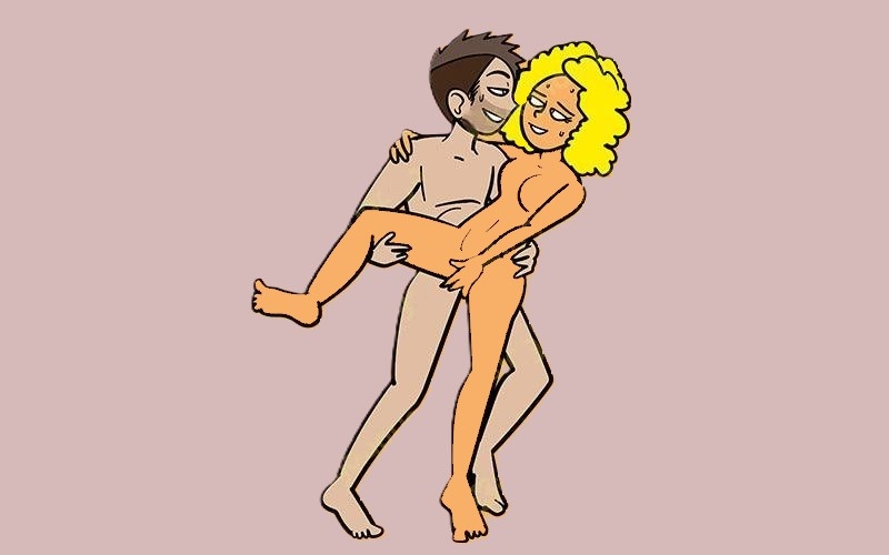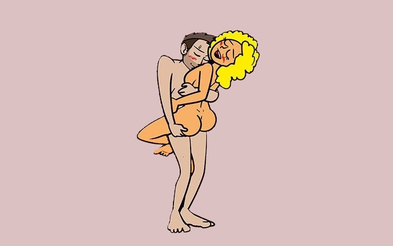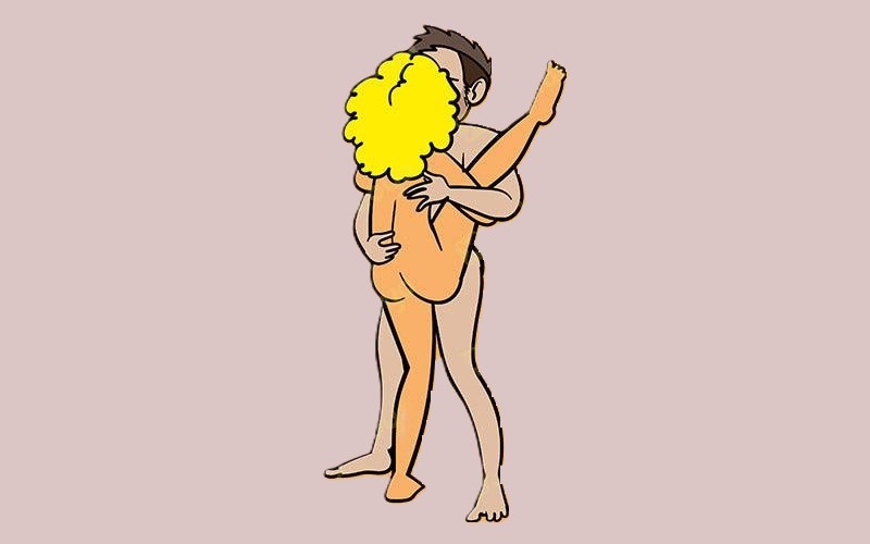 Мужчина стоит, выпрямившись. Женщина стоит лицом к нему, закидывая одну ногу на его бедро. Одной рукой она обхватывает шею партнера, а второй направляет его лицо к своей груди. Мужчина держит ногу женщины на своем бедре; свободной рукой он обнимает ее талию и наклоняется вперед, лаская грудь партнерши.