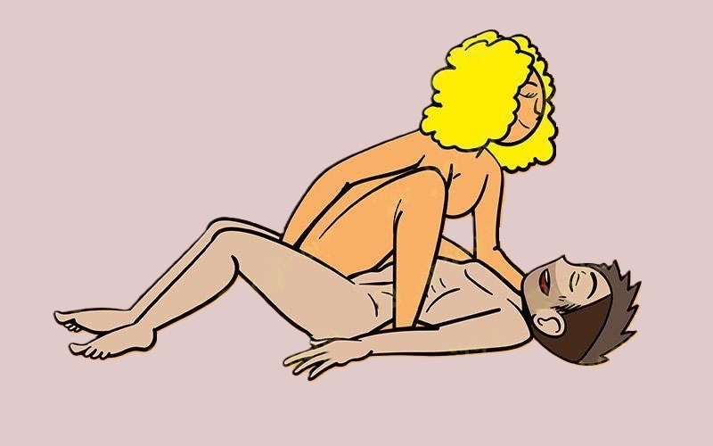 Мужчина ложится на спину и раздвигает ноги. Женщина садится на член, слегка откинувшись назад, опирается на руки, расставленные рядом с предплечьями мужчины. Она сгибает колени и закидывает ногу на другую так, чтобы правая нога находилась в свободном падении. Партнер берет любовницу за ягодицы и помогает ей двигаться.