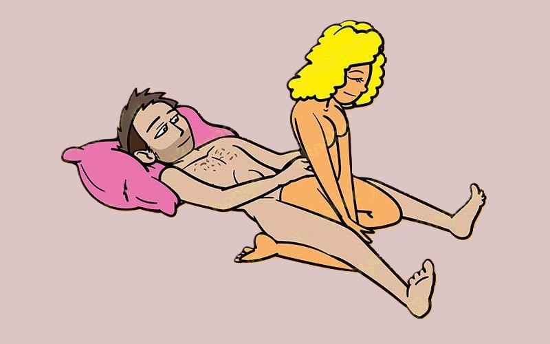 Мужчина лежит на спине на подушке, верхняя часть тела находится в приподнятом положении, ноги прямые и разведены в стороны. Женщина становится на колени между ног своего партнера, спиной к нему, так, чтобы ее голени оказались под бедрами мужчины. Ее голова опущена, руки прямые и расположены близко к коленям. Его руки лежат на ягодицах партнерши, он двигает ими в такт рывкам.