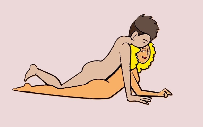 Женщина удобно лежит на спине, она раздвинула ноги и слегка сгибает колени. Мужчина располагается между ее ног, лежа на животе. Его ноги также согнуты в коленях и подняты вверх, руками он держит ягодицы любовницы. А в остальном все зависит от полета его воображения. Мужчина может долгое время терзать свою соблазнительницу в такой позе, не давая ей ощутить оргазм, или действовать более решительно и четко, намеренно доводя ее до экстаза.