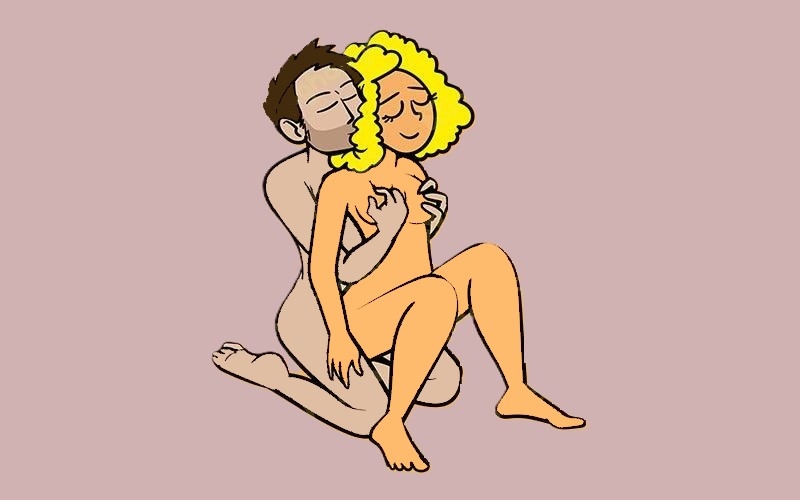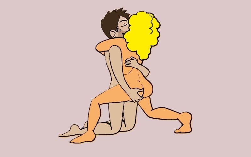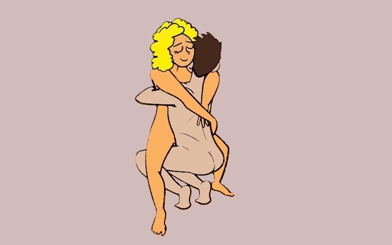 Мужчина становится на колени, выпрямив спину. Женщина стоит на полусогнутых ногах, прислонившись к мужчине, лицом к нему. Мужчина обнимает ее одной рукой за спину, вторую руку кладет ей на ягодицы. Партнерша обнимает его за шею и кладет голову ему на плечо.