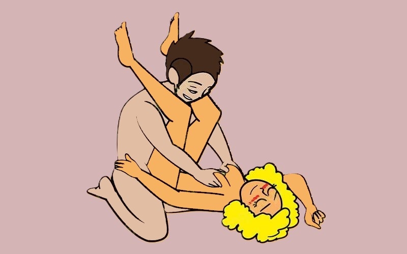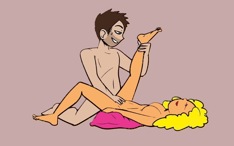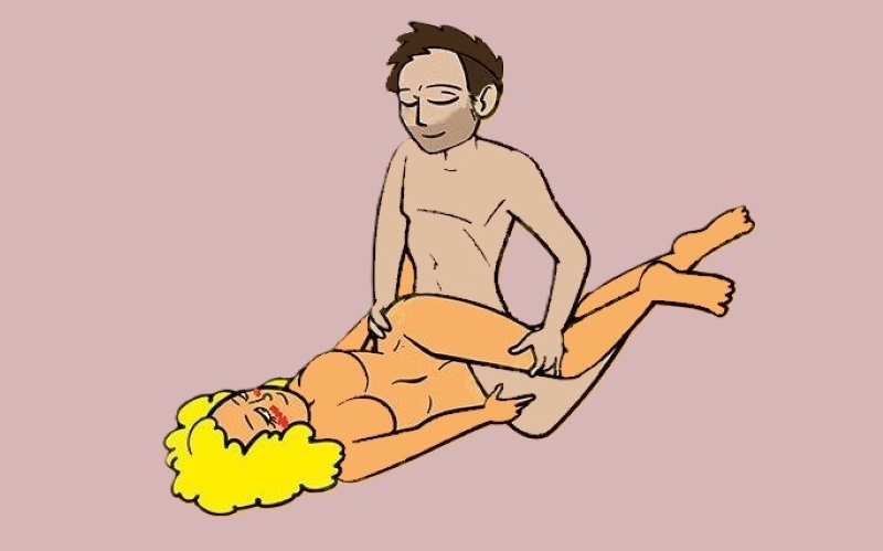 Под ягодицы женщины подложена подушка. Ее руки вытянуты вдоль тела, одна нога согнута в колене, другая вытянута и поднята вверх. Мужчина располагается сбоку от возлюбленной на коленях, его ноги разведены в стороны. Одну руку мужчина кладет на промежность женщины и ласкает ее, второй рукой берется за лодыжку ее выпрямленной ноги.