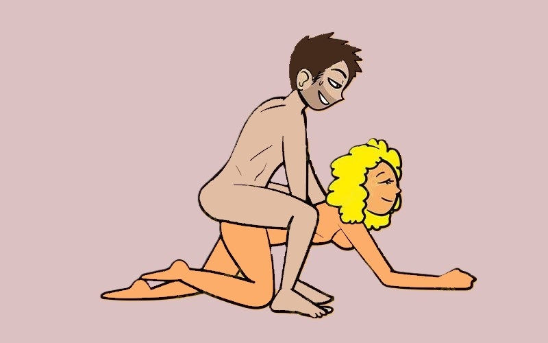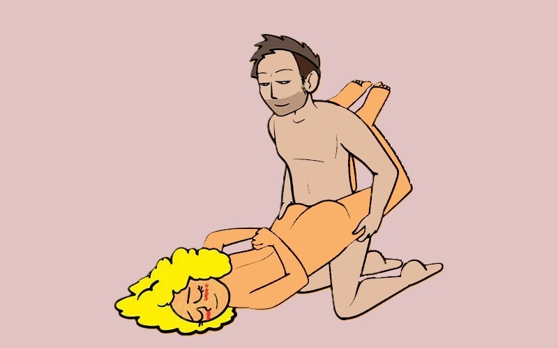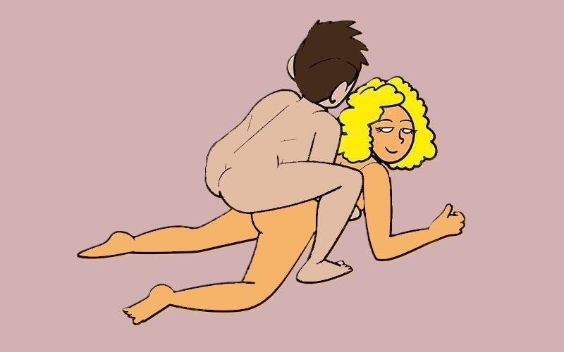 Женщина лежит на животе, спиной к любовнику. Ее руки сцеплены за спиной, а ноги разведены в стороны. Мужчина становится на колени между ее ног, руками берет женщину за бедра и слегка приподнимает тело своей любовницы. Женщина сгибает колени и прижимает ноги к спине партнера.