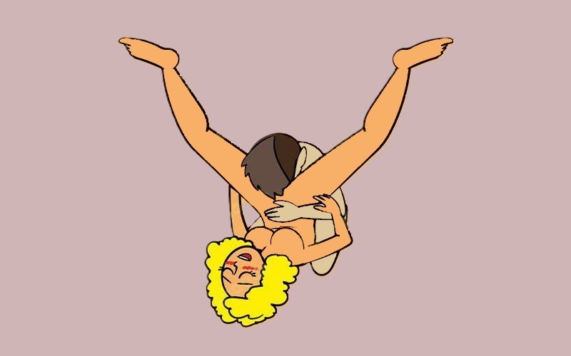 Женщина лежит на спине, ее ноги разведены и подняты вверх. Мужчина становится на колени у ягодиц женщины, широко расставив ноги. Руками мужчина берет партнершу за лодыжки и раздвигает ее ноги. Одной рукой женщина ласкает свою промежность, другую вытягивает вдоль тела.