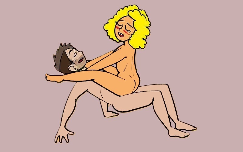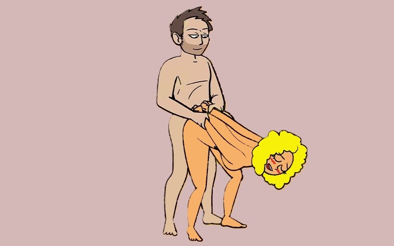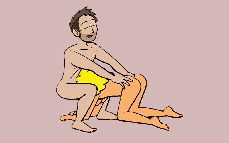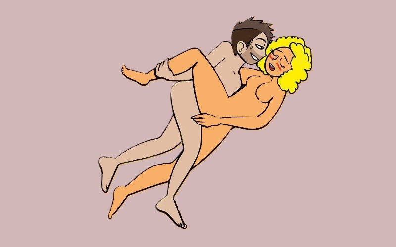 Мужчина приседает и поднимается на цыпочки. Женщина сидит у него на бедрах, касаясь пола ногами и обнимая его шею. Мужчина обнимает любовницу за спину. В этой позе женщина задает ритм, а еще она отлично подходит для поцелуев.
