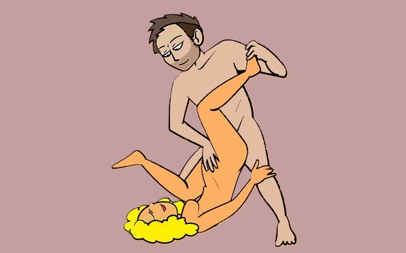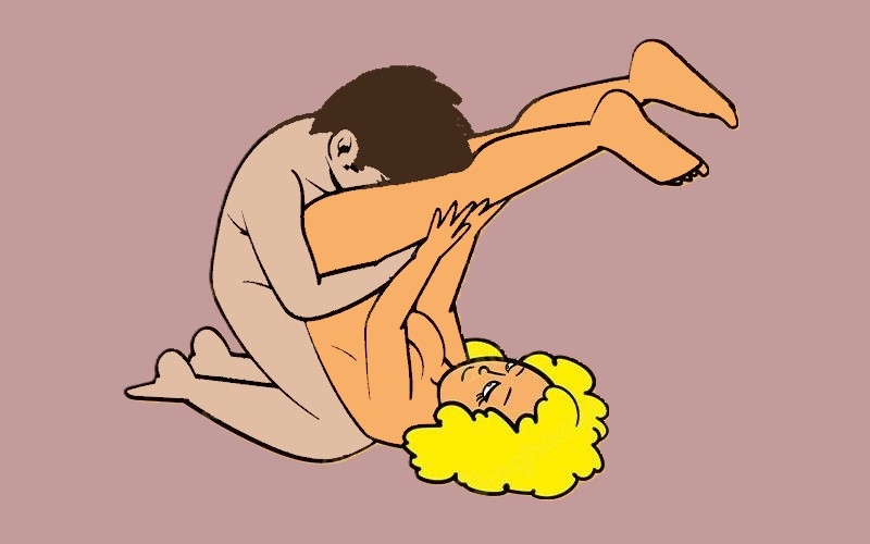 Женщина лежит на спине, подняв согнутые в коленях ноги вверх и раздвинув их. Мужчина нависает над партнершей, опираясь на вытянутые руки и колени; его ноги сведены вместе. Ноги женщины закинуты на плечи мужчины.