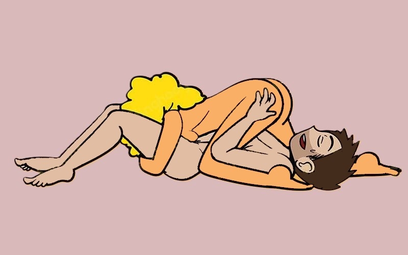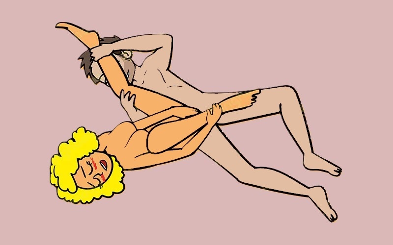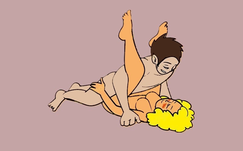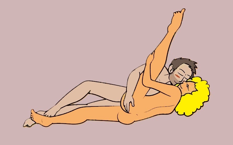Мужчина лежит на боку, его ноги слегка разведены в стороны. Женщина лежит, повернувшись слегка боком по отношению к партнеру. Ее ноги широко расставлены, колени согнуты. Одной рукой мужчина берет ее за лодыжку, другой поддерживает ее за талию.