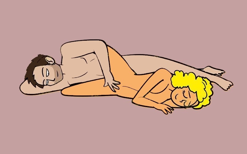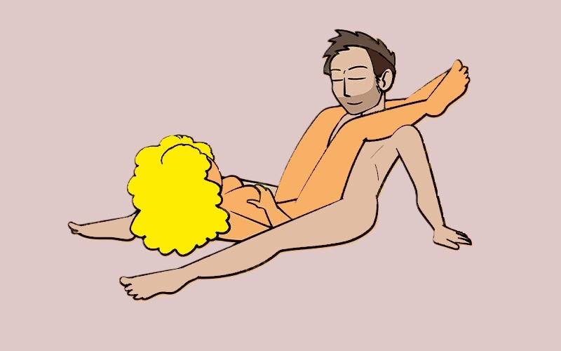 Это «ленивый» способ осуществления сексуальных действий. Женщина лежит на боку, спиной к мужчине, подложив руку под голову. Ее голова лежит у ног мужчины. Ноги она сгибает в коленях и разводит в стороны. Мужчина лежит между ног своей любовницы, подложив руку под голову; другой рукой он ласкает промежность женщины.