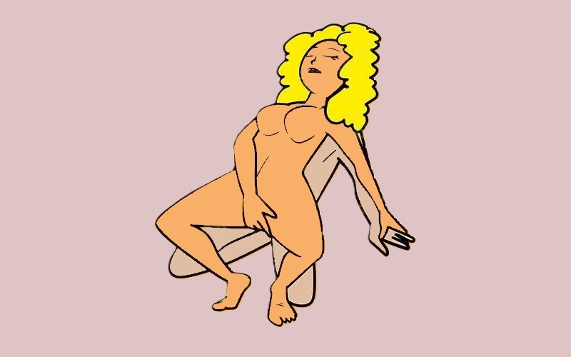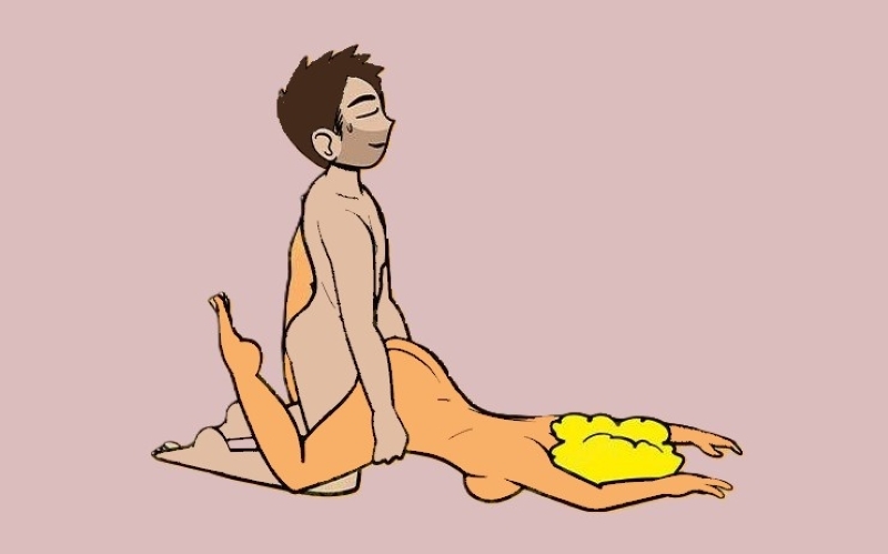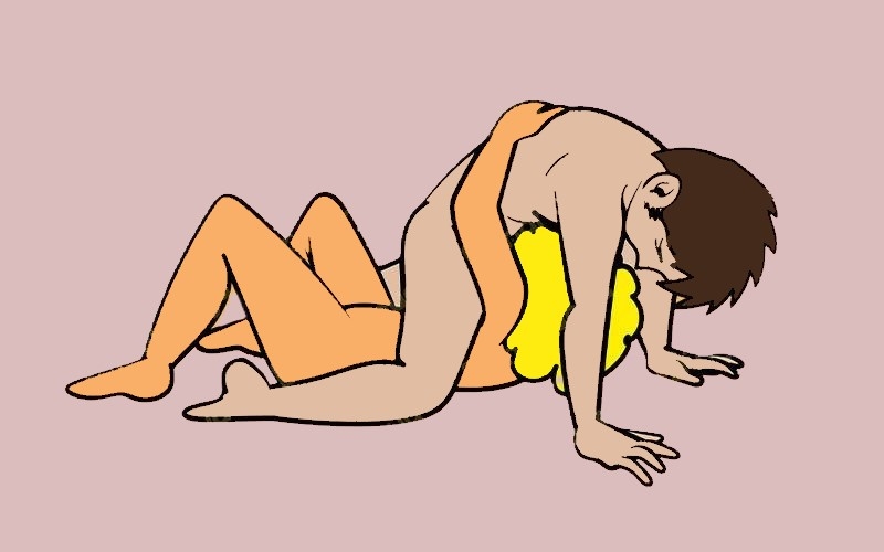 Женщина ложится на живот, вытягивая руки вперед и сгибая локти. Одну ногу она сгибает так, чтобы верхняя часть ее туловища была слегка приподнята. Мужчина проникает в нее со спины, как будто сидит на ее ягодицах. Ноги партнера согнуты в коленях и находятся по бокам женщины, а руками он держит грудь любовницы.