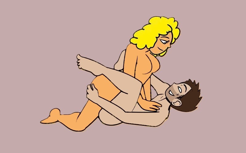 Мужчина лежит на спине, его ноги согнуты в коленях. Он прижимает ноги к телу и широко разводит их. Женщина стоит на коленях между ногами своего партнера; она разводит ноги в стороны и смыкает ступни. Женщина опирается на грудь мужчины и слегка наклоняется вперед. Мужчина кладет лодыжки на ягодицы своей любовницы, а руками придерживает ее за бедра.