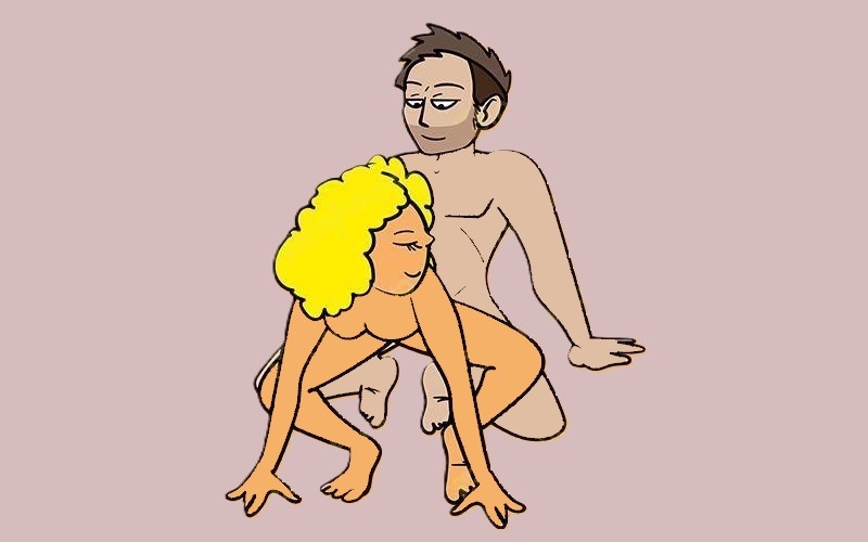 Женщина стоит на четвереньках, опираясь на локти и колени. Ее ноги раздвинуты, одна лодыжка опирается о другую. Мужчина приседает над своей дамой так, чтобы его ступни оказались рядом с ее коленями. Руками он придерживает партнершу за грудь или плечи.