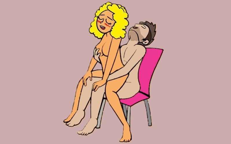 Мужчина садится на стул и кладет голову на спинку стула. Он слегка разводит ноги в стороны, опираясь на кончики пальцев. Женщина сидит на нем, спиной к партнеру. Она слегка наклоняет тело вперед и запрокидывает голову назад. Ее ноги широко расставлены, а ладони лежат на коленях партнера.
