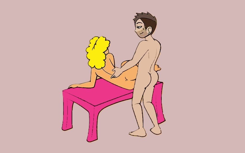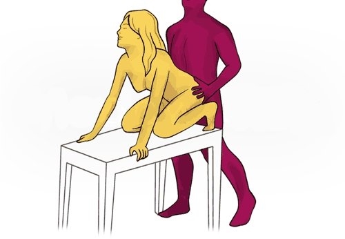 Женщина лежит боком на столе, сгибая одну руку в локте. Ее ноги сжаты и слегка согнуты, бедра лежат на столе, а ноги свисают с него. Мужчина входит в свою даму сзади. Он стоит за столом, выпрямив спину и расставив ноги на ширине плеч. Его вытянутые руки лежат на ягодицах и коленях женщины.