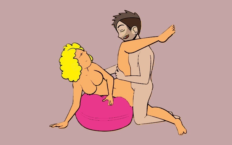 Женщина ложится животом на фитнес-мяч, лицом вниз. Она сгибает руки в локтях и кладет лицо на ладони. Мужчина встает позади любовницы, приподнимает ее бедра так, чтобы войти в нее, немного откидывается назад и упирается коленями в мяч. Женщина обхватывает ногами талию мужчины и смыкает их за его спиной.