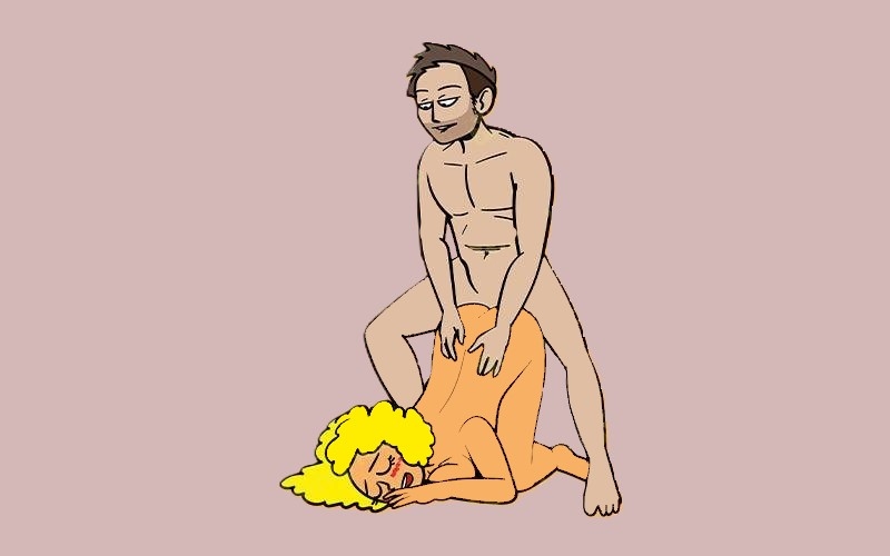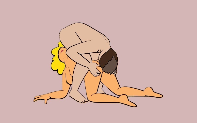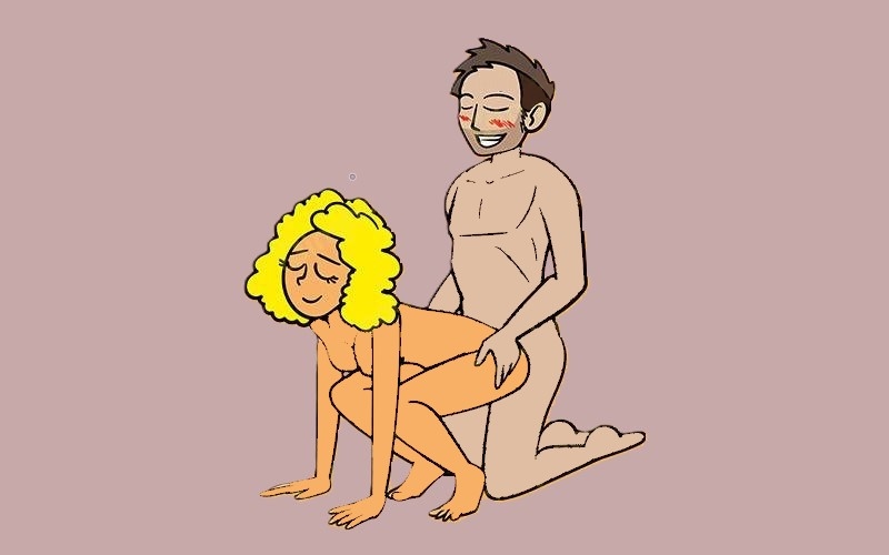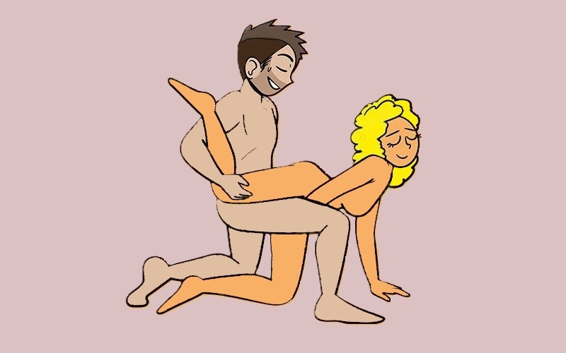 Женщина забирается на кровать и становится на четвереньки. Она наклоняет верхнюю часть тела вперед и опирается на ладони вытянутых рук. Мужчина стоит за своей возлюбленной, держа ее за талию, и совершает фрикции.