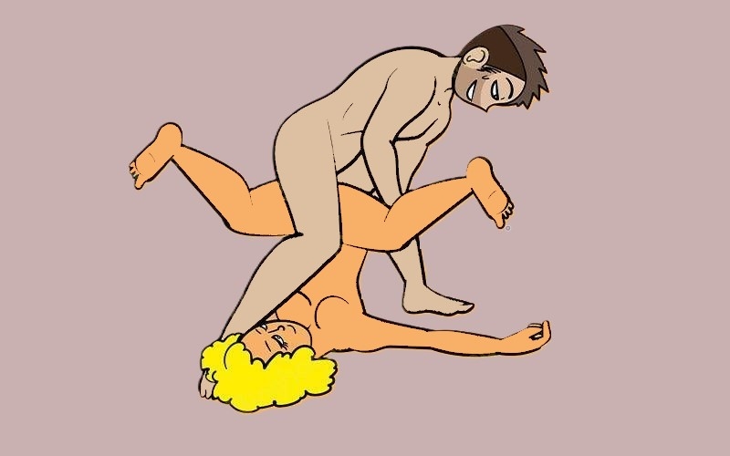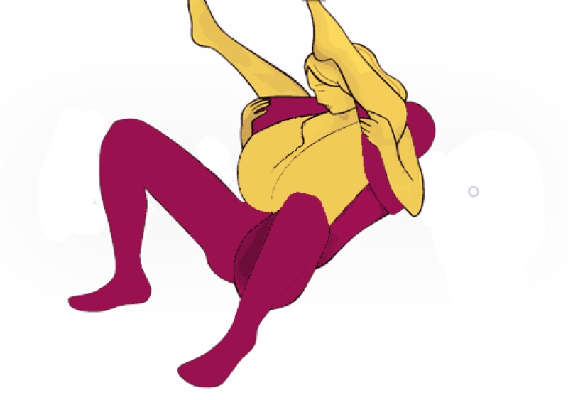Женщина ложится на спину, поднимая таз и ноги как можно выше. Она откидывает ноги назад, к голове, поддерживая себя за бедра. Мужчина садится на партнершу сверху и хватает ее за ноги, слегка выдвигая их вперед. Одна из его ладоней лежит на бедре возлюбленной, а другой он опирается о свою ногу.
