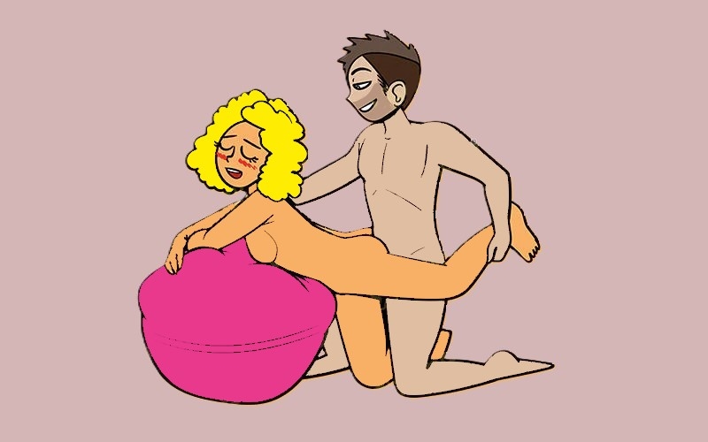 Женщина лежит на боку на фитнес-мяче. Ее рука и нога лежат на полу. Другую руку она кладет на мяч возле талии, и поднимает вторую ногу. Мужчина становится на колени так, чтобы ее нога оказалась между его бедер. Он закидывает ее поднятую ногу себе на плечо. Одной рукой он обнимает возлюбленную, второй держит ее за бедро.