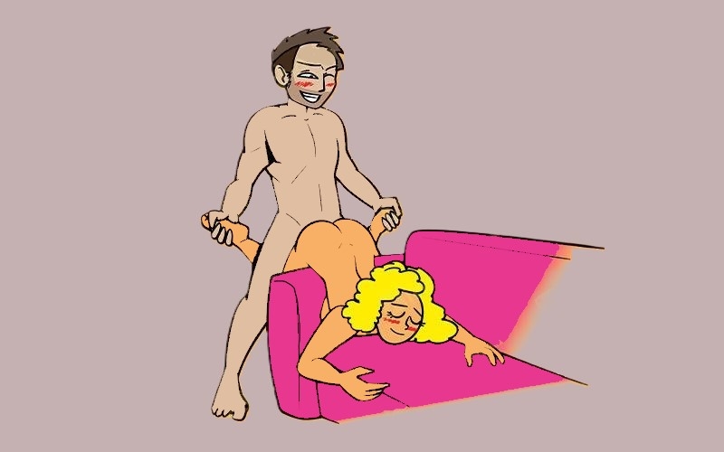 Женщина лежит на животе, перегибаясь через подлокотник дивана. Мужчина стоит позади нее. Партнерша помещает свои ноги между бедрами мужчины. Партнер берет руками ее ноги и разводит их в стороны. В этом положении спина мужчины в течение всего сеанса секса должна быть прямой, а ноги находятся на ширине плеч.