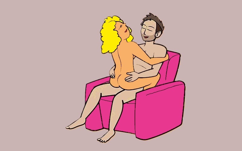 Мужчина сидит на самом краю кресла, откинувшись назад. Кончиками пальцев ног он упирается в пол, сгибает ноги в коленях и широко их разводит. Женщина садится на партнера, спиной к нему. Ее ноги прямые, как будто она садится на шпагат. Она отводит руки назад и кладет их на тело любовника, а он начинает совершать быстрые движения бедрами.