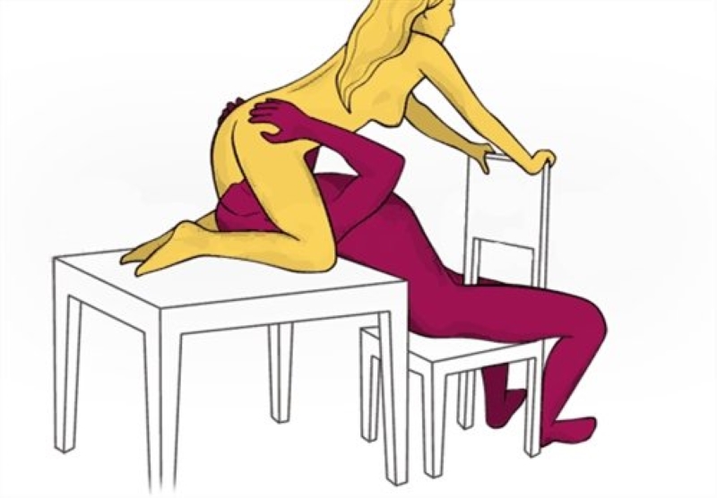Кухня подходит не только для приготовления и принятия пищи, но и для сексуальных утех! В любой кухне найдутся стол и стул, а они-то и нужны для этой позы. Мужчина присаживается на стул; он ложится верхней частью туловища на столешницу. На столе удобно располагается его партнерша, стоя на коленях и придерживаясь за стул. Мужчина ласкает языком возлюбленную, придерживая ее руками за ягодицы.