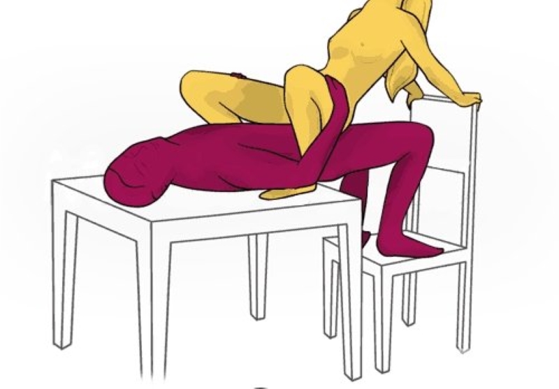 В каждом доме есть стол, но не все догадываются о его секс-предназначении. Небо — не самая простая, но очень возбуждающая поза, которая помогает любовникам «взлететь». Мужчина ложится на столешницу, упираясь ногами в стул, стоящий рядом со столом. Его партнерша садится на член любовника и отклоняется назад, опираясь о спинку стула.