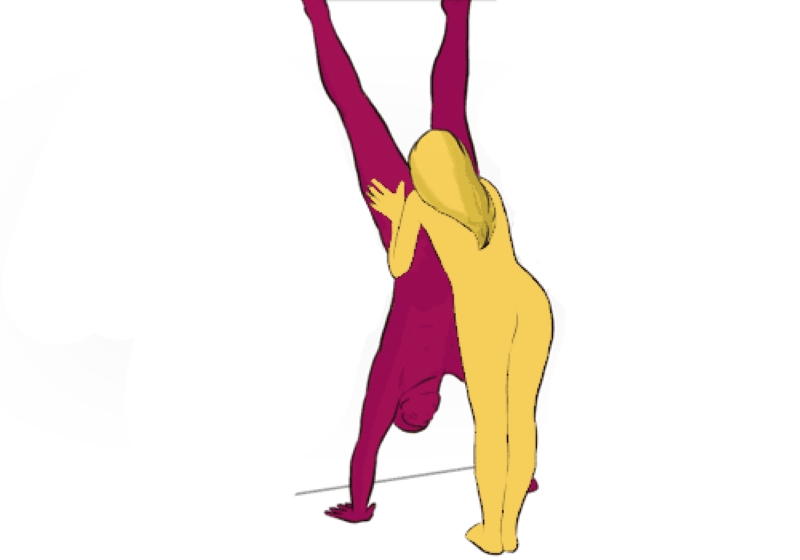 Мужчина стоит на вытянутых руках, опираясь на стену. Его ноги вытянуты и разведены в стороны. Женщина становится лицом к своему партнеру, наклоняется и начинает ласкать ртом и руками его гениталии.