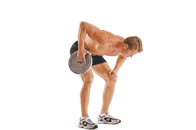 А. Правой рукой возьмите гантель или гантельную шайбу (диск) и удерживайте вдоль тела, тыльной стороной кисти наружу. Верхнюю часть туловища наклоните вперед, левой рукой обопритесь на левое колено.