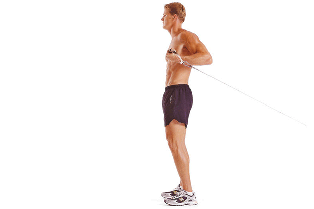 B. Руку согните в локте, кабель притяните вверх до тех пор, пока предплечье не будет параллельно полу. Небольшая пауза, затем вернитесь в исходную позицию. Локти не должны двигаться.
