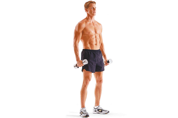 А. Держа по гантели в каждой руке, с ладонями, развернутыми к телу, стоите прямо. Ступни расставлены на расстоянии плеч, колени слегка согнуты.