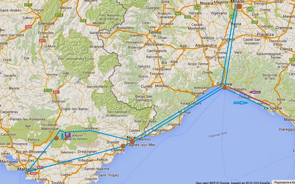 Милан (переезд в Геную) – Генуя (остановка на ночь) – Чинква Тэррэ (проездом) – Вентимилья (проездом) – Монако (проездом) – Кань сюр Мер (остановка на три ночи) – Марсель (проездом) – Сан Мартин де Бромс (остановка в отеле) – Валансоль (проездом) – Рье (проездом) – Монтанья (проездом) – Монпеза (остановка на ночь) – Рье (проездом) – Кастелан (проездом) – Ницца (остановка на ночь) – Вентимилья (проездом) – Милан (остановка на ночь).
