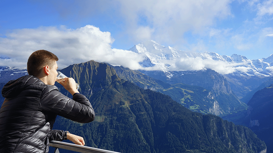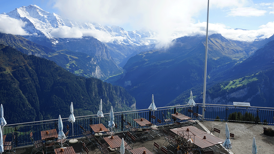 Нагуляв аппетит, рекомендуем вам заглянуть в уютный ресторанчик, чтобы поужинать известными швейцарскими блюдами (например, сырным фондю) или выпить чашку кофе. С ресторана открывается великолепная панорама на Швейцарские Альпы. В теплое время года можно занять столики на улице с захватывающим видом. Сегодня ресторан оборудовали летней террасой на 500 человек, так что место для вас точно найдется. Предварительная бронь не требуется.