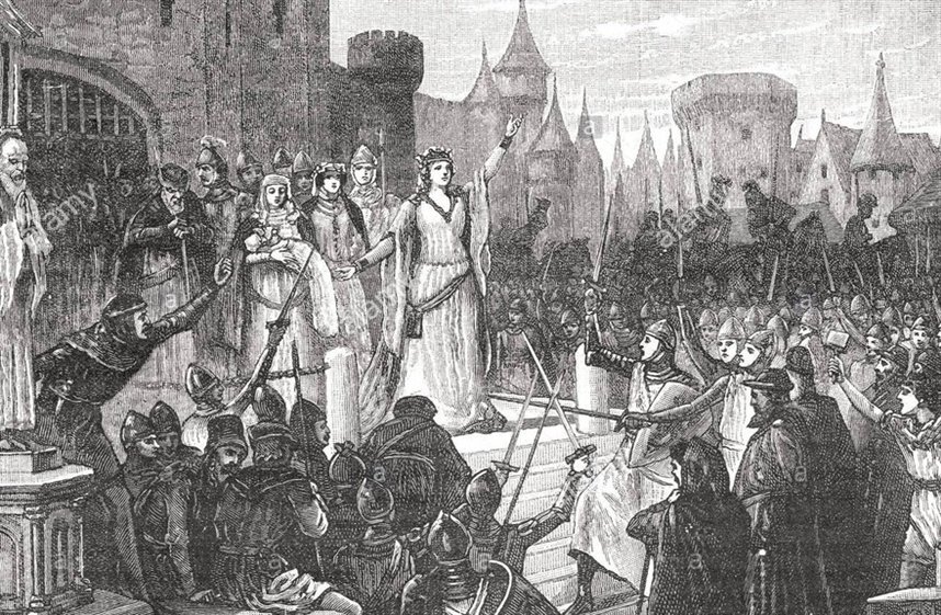 Кроме Орлеанской девы, в истории Франции была еще одна воинственная Жанна, также известная как Жанна де Монфор и Жанна ла Фламм. Она была супругой Иоанна IV, герцога Бретанского во время конфликта между домами Блуа и де Монфор за контроль над герцогством Бретань. Это стало известно как Бретонская война за наследство с 1341 по 1364 год, в эпоху Столетней войны. Когда Иоанн умер в 1345 году, Жанна организовала сопротивление, чтобы защитить своего сына, Джона V, герцога Бретанского. Она взяла в руки оружие и надела доспехи, став на защиту города и призывая женщин «разрезать юбки и взять безопасность в свои руки». Возглавив отряд рыцарей за городскими стенами, она напала на вражеский тыловой лагерь, подожгла его и уничтожила, и это было лишь одним из ее многочисленных подвигов. Писатель Жан Фруассар говорил, что «у нее было сердце льва».
